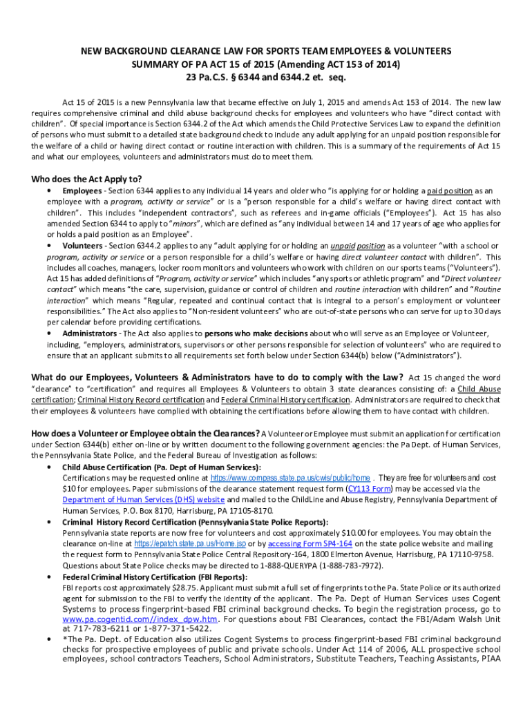 NEW BACKGROUND CLEARANCE LAW FOR SPORTS TEAM EMPLOYEES & VOLUNTEERS SUMMARY OF PA ACT 15 of 2015 (Amending ACT 153 of 2014) 23 Pa. C.S. 6344 and 6344.2 ET. seq. Act 15 of 2015 is a new Pennsylvania