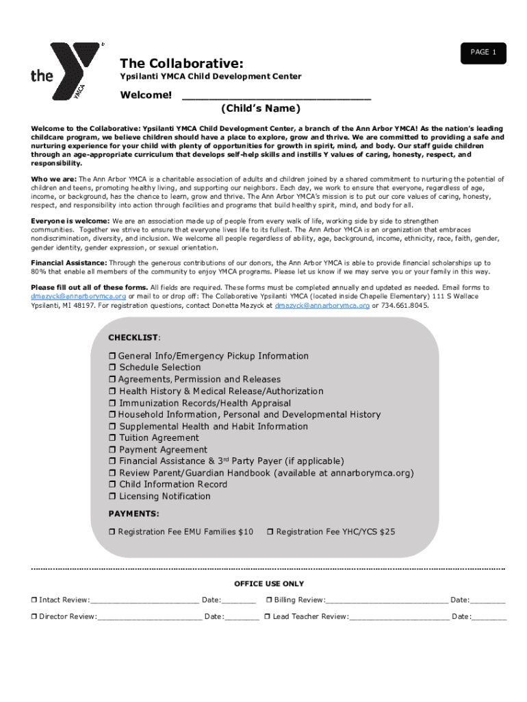 PAGE 1The Collaborative:Ypsilanti YMCA Child Development CenterWelcome!___ (Child's Name)Welcome to the Collaborative: Ypsilanti YMCA Child Development Center, a branch of the Ann Arbor YMCA! As the