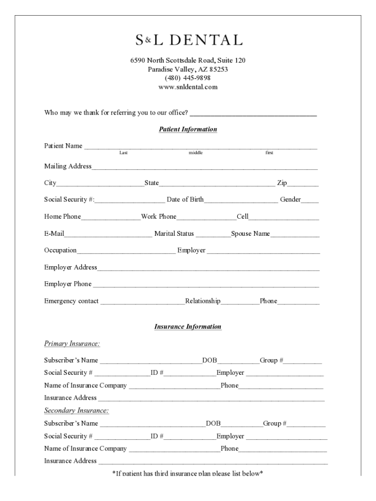 6590 North Scottsdale Road, Suite 120 Paradise Valley, AZ 85253 (480) 4459898 www.snldental.com Who may we thank for referring you to our office? ___ Patient Information Patient Name ___ LastmiddlefirstMailing