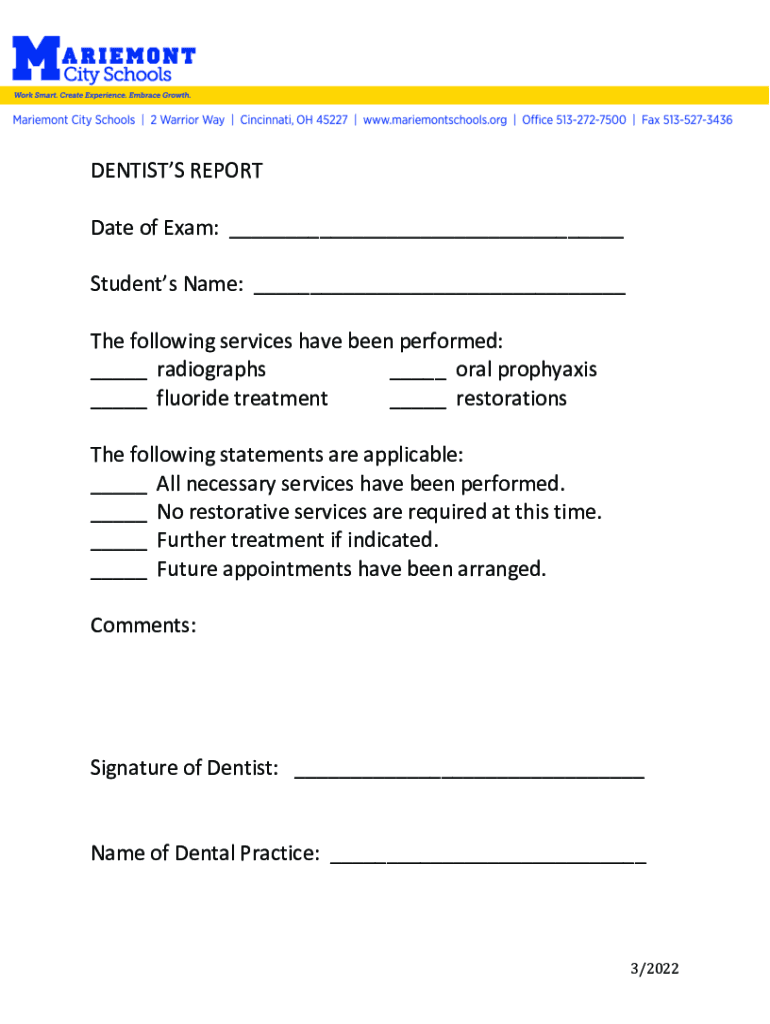 DENTISTS REPORT Date of Exam: ___ Students Name: ___ The following services have been performed: ___ radiographs ___ oral prophylaxis ___ fluoride treatment ___ restorations The following statements