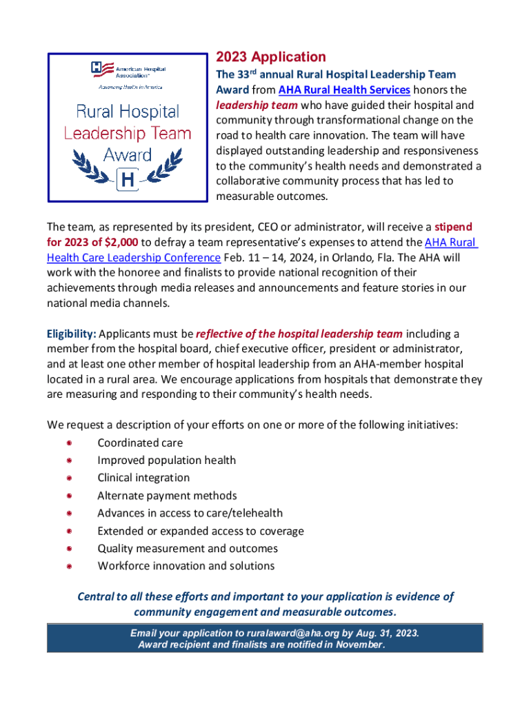 2023 Application 33rd annual Rural Hospital Leadership Team Award from AHA Rural Health Services honors the leadership team who have guided their hospital and community through transformational change