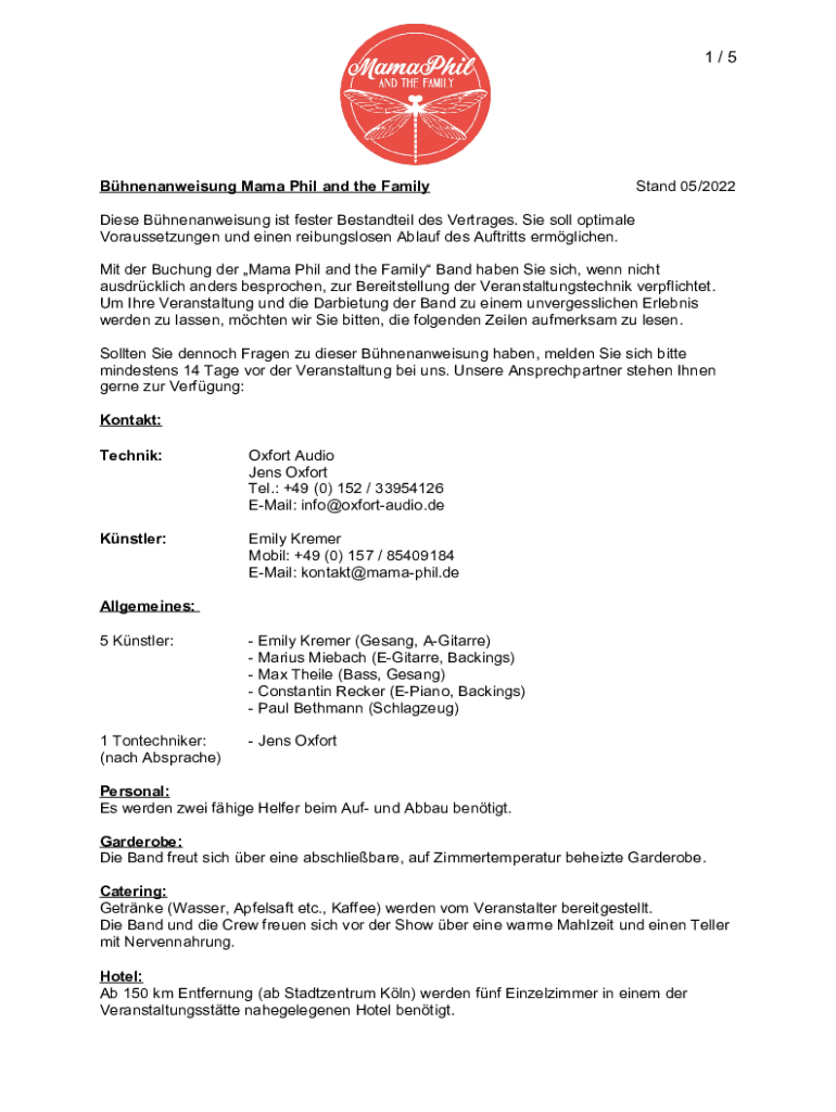 1/5Bhnenanweisung Mother Phil and the FamilyStand 05/2022Diese Bhnenanweisung is fester Bestandteil DES Vert rages. She sold optimal