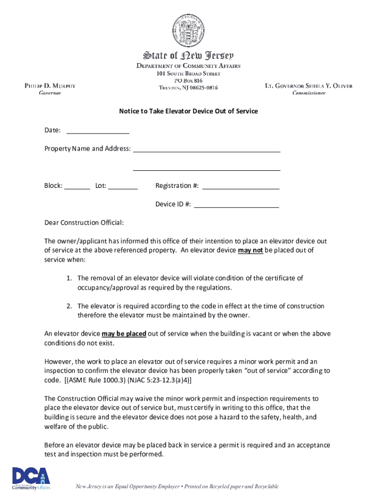 Notice to Take Elevator Device Out of Service Date: ___ Property Name and Address: ___ ___ Block: ___ Lot: ___Registration #: ___ Device ID #: ___Dear Construction Official: The owner/applicant has