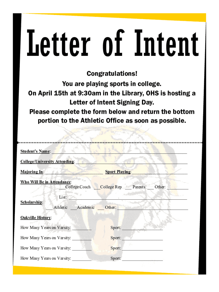 Letter of Intent Congratulations! You are playing sports in college. On April 15th at 9:30am in the Library, OHS is hosting a Letter of Intent Signing Day. Please complete the form below and return