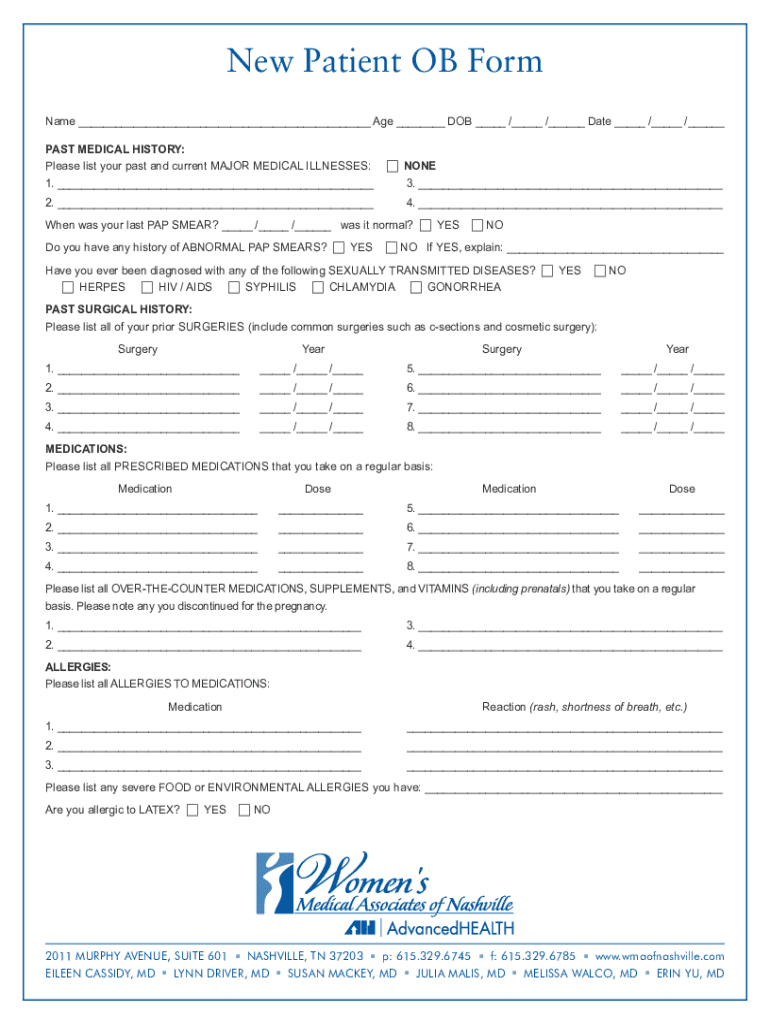New Patient OB Form Name ___ Age ___ DOB ___ /___ /___ Date ___ /___ /___ PAST MEDICAL HISTORY: Please list your past and current MAJOR MEDICAL ILLNESSES: NONE 3. ___ 1. ___2. ___4. ___When was your