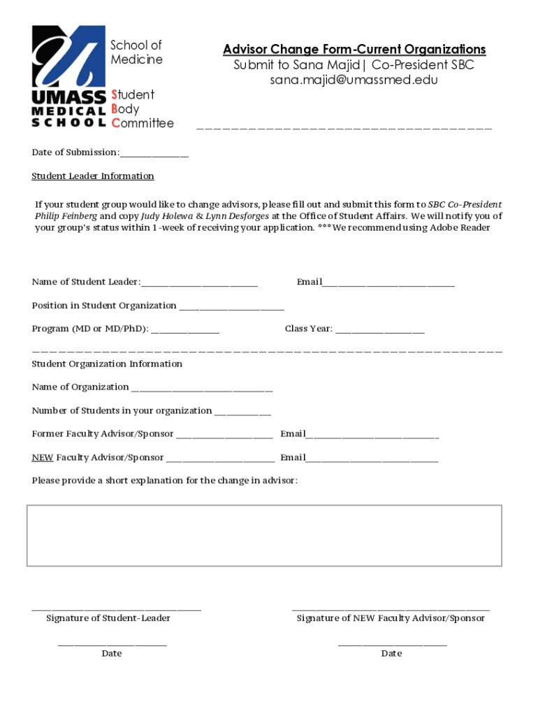 School of Medicine Student Body CommitteeAdvisor Change Concurrent Organizations Submit to Sana Majid| CoP resident SBC sana.majid@umassmed.eduDate of Submission:___ Student Leader Information If