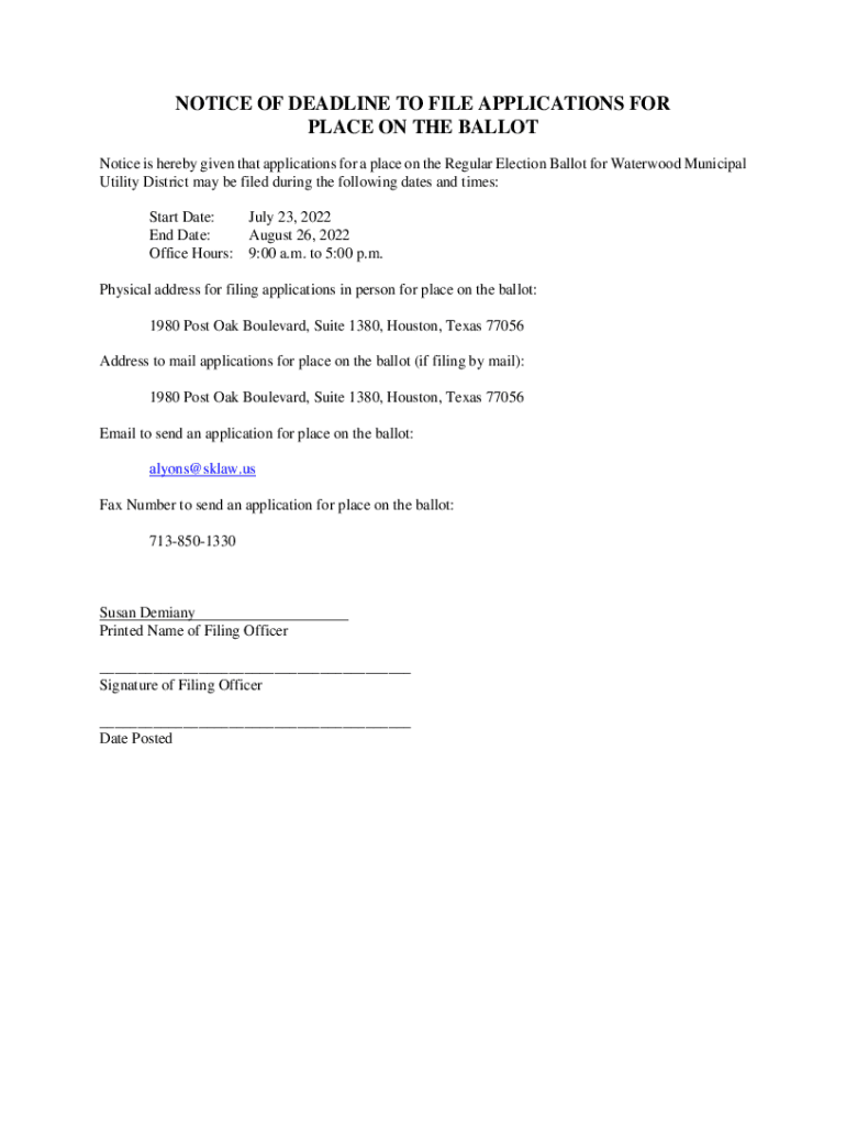 NOTICE OF DEADLINE TO FILE APPLICATIONS FOR PLACE ON THE BALLOT Notice is hereby given that applications for a place on the Regular Election Ballot for Water wood Municipal Utility District may be