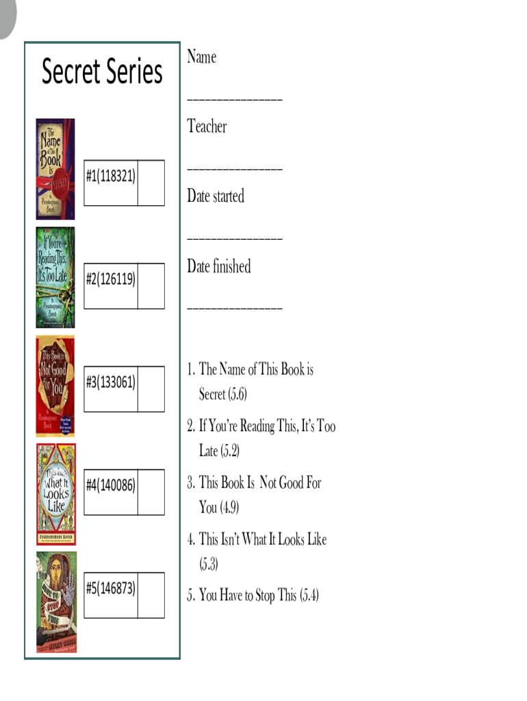 Secret Suriname ___ Teacher#1(118321)___ Date started ___#2(126119)Date finished ___#3(133061)1. The Name of This Book is Secret (5.6) 2. If You're Reading This, Its Too Late (5.2)#4(140086)3. This