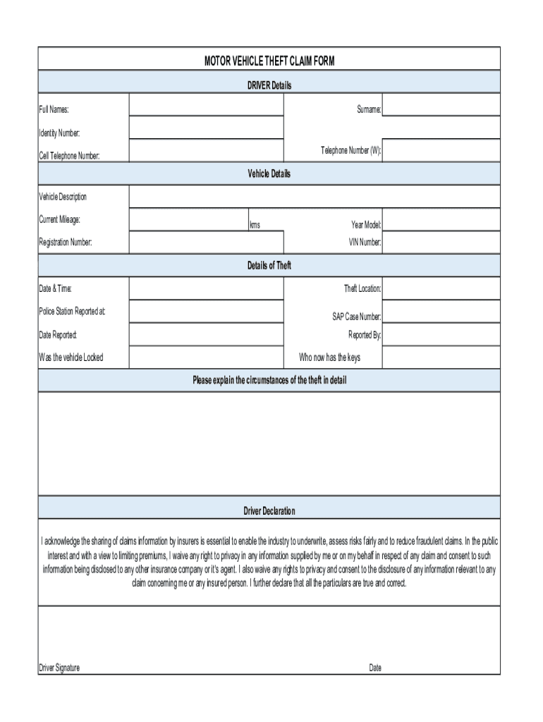 MOTOR VEHICLE THEFT CLAIM FORM DRIVER Details Full Names:Surname:Identity Number: Telephone Number (W):Cell Telephone Number:Vehicle Details Vehicle Description Current Mileage:year Model:Registration