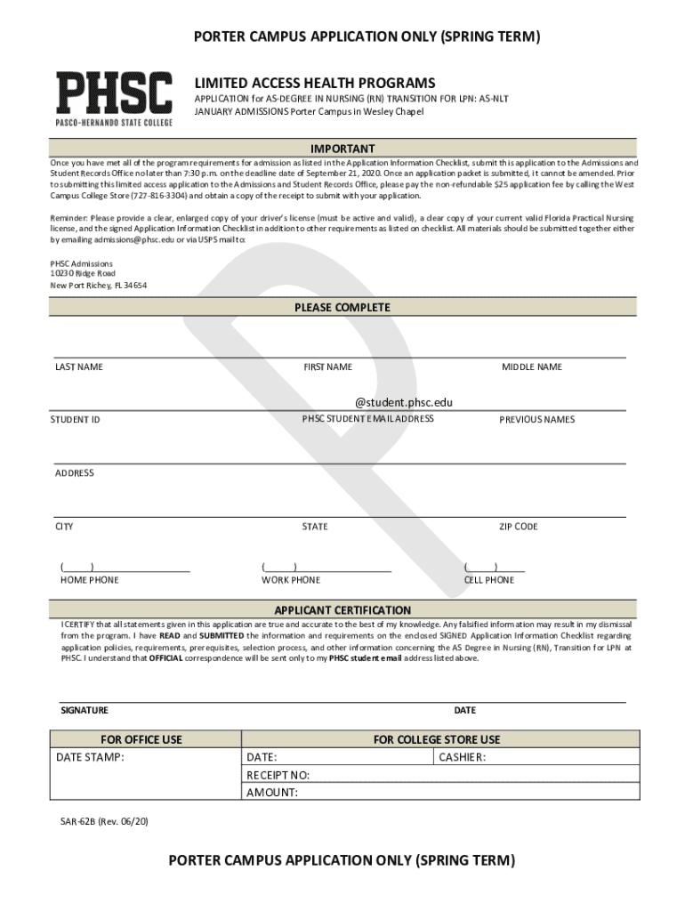 PORTER CAMPUS APPLICATION ONLY (SPRING TERM) LIMITED ACCESS HEALTH PROGRAMS APPLICATION for DEGREE IN NURSING (RN) TRANSITION FOR LPN: ASNL JANUARY ADMISSIONS Porter Campus in Wesley ChapelIMPORTANT