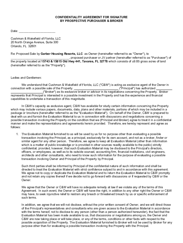 CONFIDENTIALITY AGREEMENT FOR SIGNATURE BY PROSPECTIVE PURCHASER & BROKER Date: ___ Cushman & Wakefield of Florida, LLC 20 North Orange Avenue, Suite 300 Orlando, FL 32801 Re: Proposed Sale by Garber