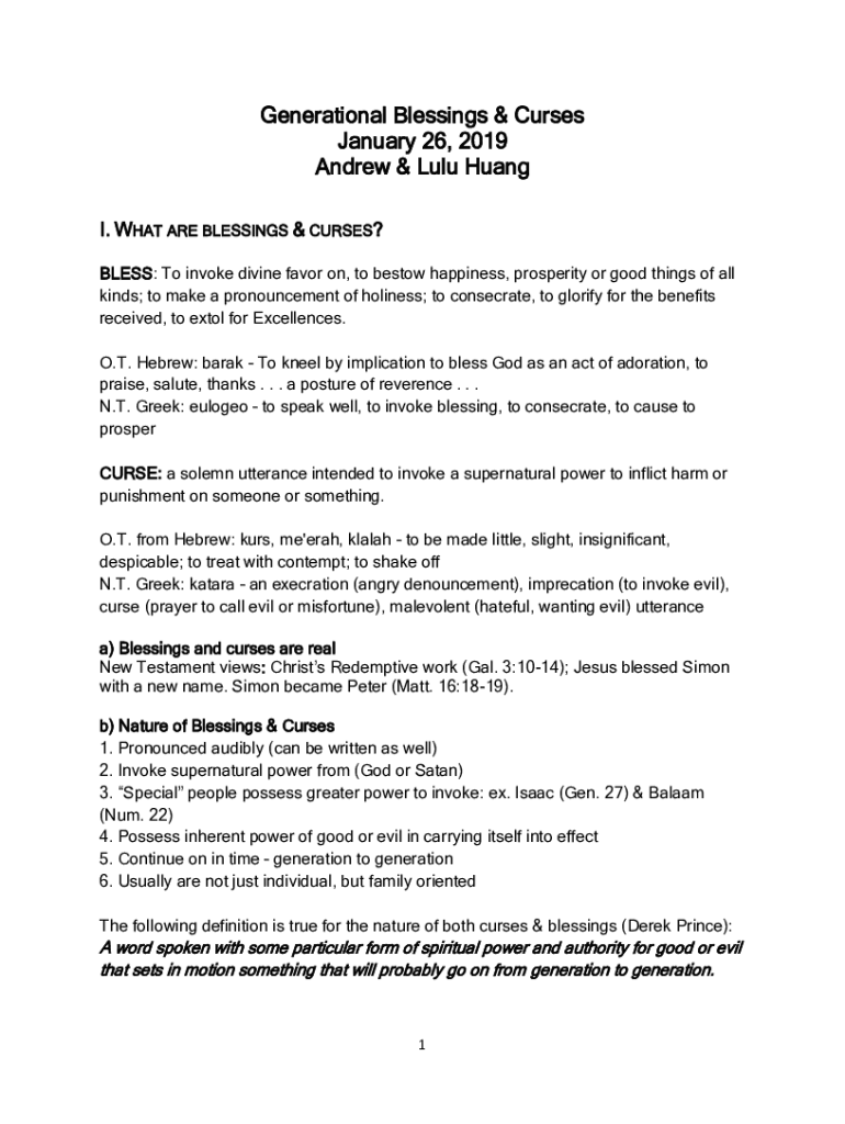 Generational Blessings & Curses January 26, 2019, Andrew & Lulu Huang I. WHAT ARE BLESSINGS & CURSES? BLESS: To invoke divine favor on, to bestow happiness, prosperity or good things of all kinds;