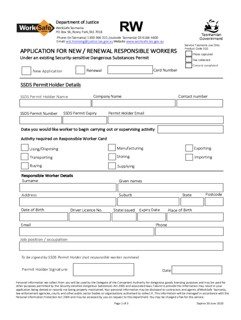 Department of Justice WorkSafeTasmania PO Box 56, Rosy Park, TAS 7018RWPhone: (in Tasmania) 1300 366 322; (outside Tasmania) 03 6166 4600 Email: wst.licensing@justice.tas.gov.auWebsite www.worksafe.tas.gov.auAPPLICATION