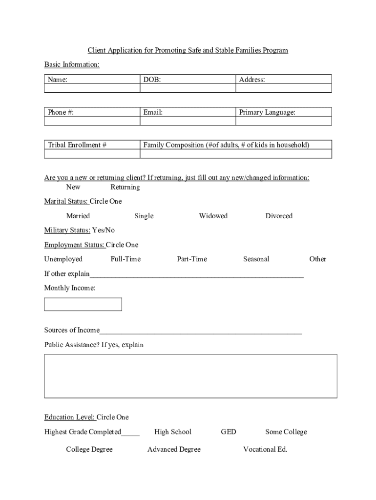 Client Application for Promoting Safe and Stable Families Program Basic Information: Name:DOB:Address:Phone #:Email:Primary Language:Tribal Enrollment #Family Composition (#of adults, # of kids in