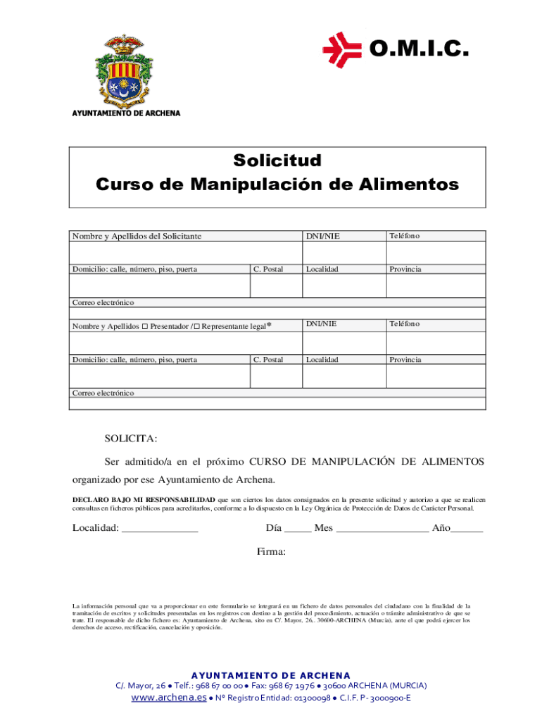 O.M.I.C. Solicited Curs' ode Manipulation de Alimentos DNI/NIETelfonoLocalidadProvinciaNombre y Spellings Presented / Represent ante legal×DNI/NIETelfonoDomicilio: called, Nero, peso, puertaLocalidadProvinciaNombre