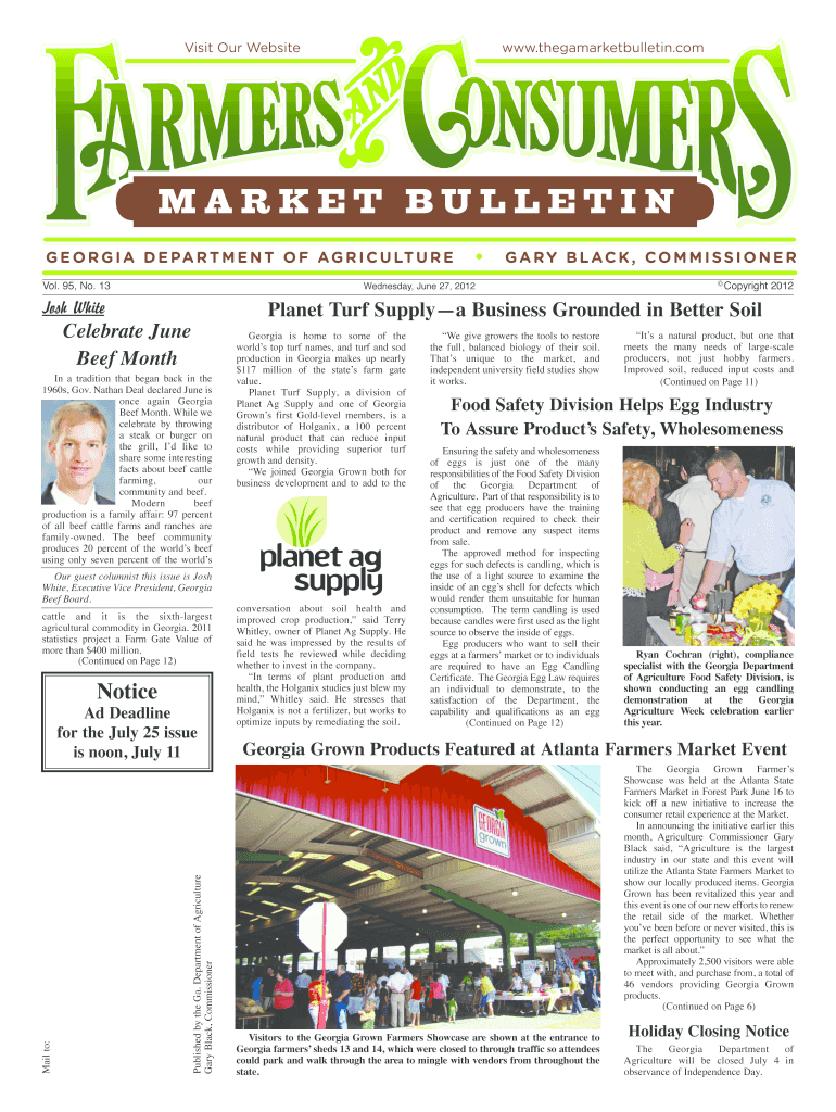 Vol. 95, No. 13 Wednesday, June 27, 2012, Josh White 2012 Planet Turf Supply Business Grounded in Better Soil Celebrate June Beef Month In a tradition that began back in the 1960s, Gov. Nathan Deal