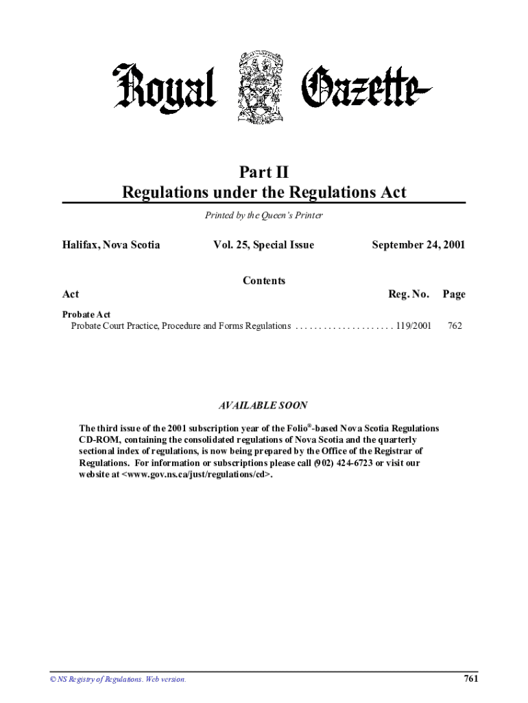 Part II Regulations under the Regulations Act Printed by the Queens Printer Halifax, Nova Scotia. 25, Special Issue September 24, 2001Contents Acting. No. Probate Act Probate Court Practice, Procedure