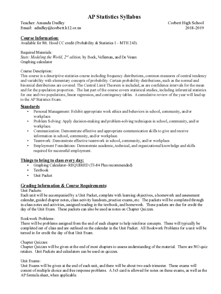 AP Statistics Syllabus Teacher: Amanda Dudley Email: adudley@corbett.k12.or.usCorbett High School 20182019Course Information: Available for Mt. Hood CC credit (Probability & Statistics I MTV 243).