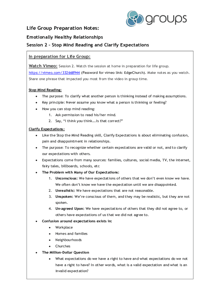 Life Group Preparation Notes: Emotionally Healthy Relationships Session 2 Stop Mind Reading and Clarify Expectations In preparation for Life Group: Watch Vimeo: Session 2. Watch the session at home