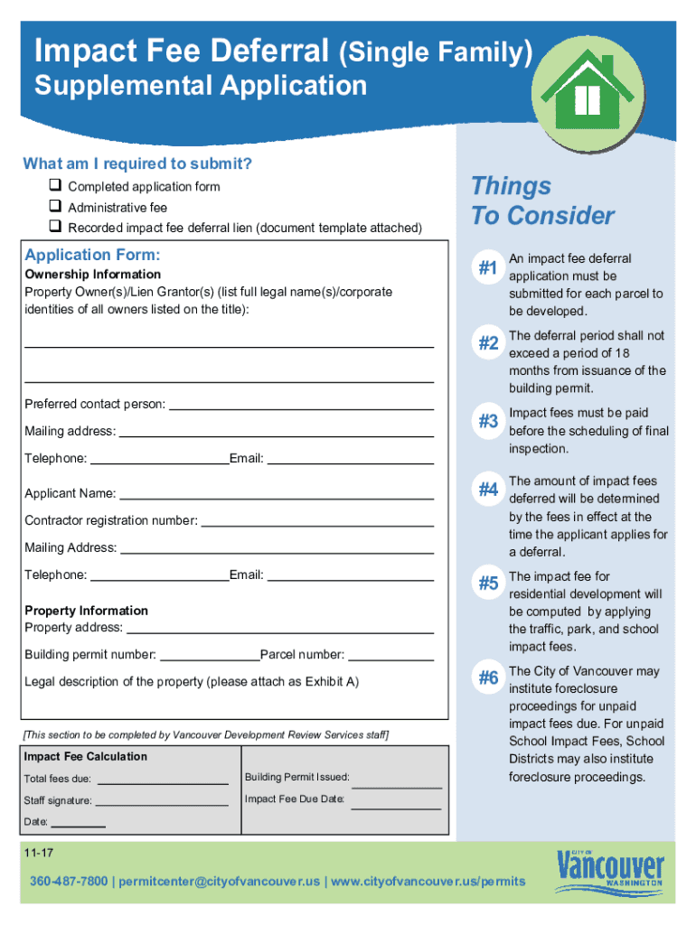 Impact Fee Deferral (Single Family) Supplemental Application What am I required to submit? Completed application form. Administrative fee Recorded impact fee deferral lien (document template attached)