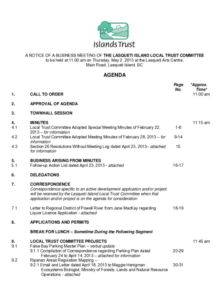 A NOTICE OF A BUSINESS MEETING OF THE BANQUET ISLAND LOCAL TRUST COMMITTEE to be held at 11:00 am on Thursday, May 2, 2013, at the Banquet Arts Center, Main Road, Banquet Island, AGENDA Page No. 1.CALL