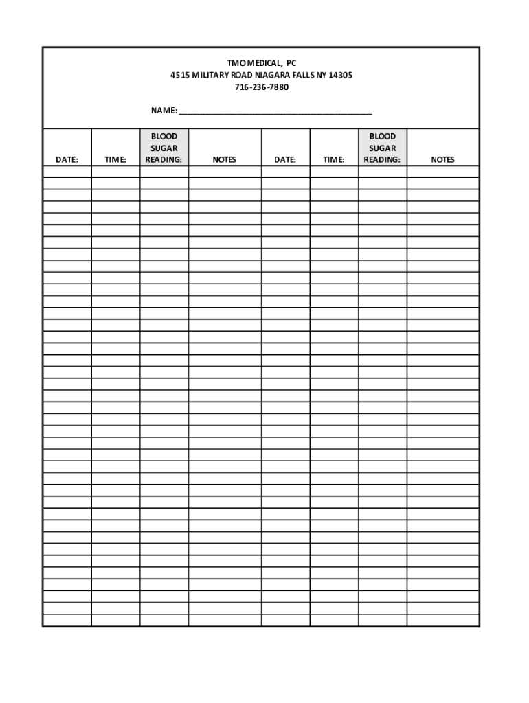TO MEDICAL, PC 4515 MILITARY ROAD NIAGARA FALLS NY 14305 7162367880 NAME: ___DATE:TIME:BLOOD SUGAR READING:INTESTATE:BLOOD SUGAR READING:TIME:.NOTES MEDICAL, PC 4515 MILITARY ROAD NIAGARA FALLS NY
