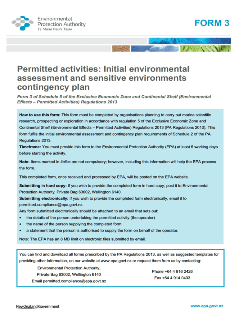2Form 3 Permitted Activities initial environmental assessment and sensitive environments' contingency planOperation name: IOP Expedition 375: Hikurangi Subduction Margin Name used by operator to reference