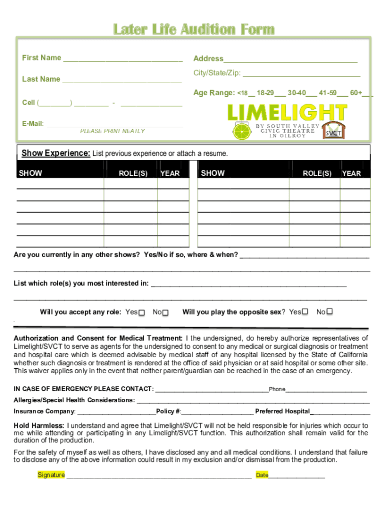 Later Life Audition Form First Name ___Address___ City/State/Zip: ___Last Name ___Age Range: 18__ 1829___ 3040___ 4159___ 60+___Cell (___) ___ ___ Email: ___ PLEASE PRINT NEATLYShow Experience: List