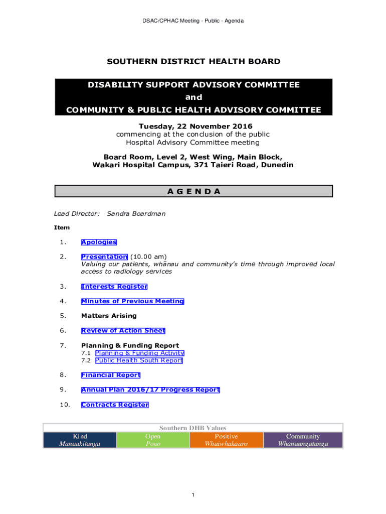 SAC/CPH AC Meeting Public AgendaSOUTHERN DISTRICT HEALTH BOARD DISABILITY SUPPORT ADVISORY COMMITTEE and COMMUNITY & PUBLIC HEALTH ADVISORY COMMITTEE Tuesday, 22 November 2016 commencing at the conclusion