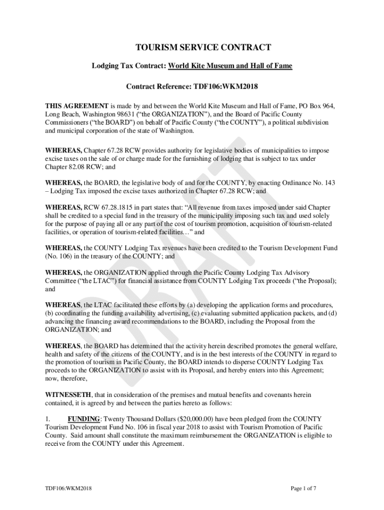 TOURISM SERVICE CONTRACT Lodging Tax Contract: World Kite Museum and Hall of Fame Contract Reference: TDF106:WKM2018 THIS AGREEMENT is made by and between the World Kite Museum and Hall of Fame, PO