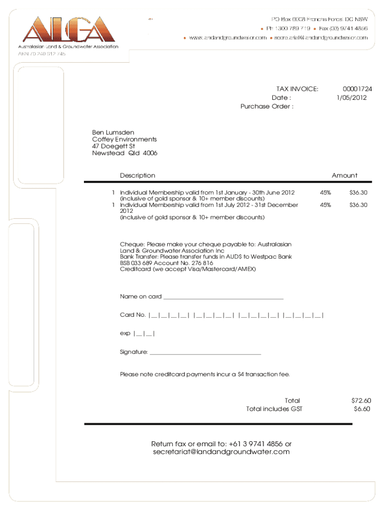 TAX INVOICE: Date : Purchase Order :00001724 1/05/2012Ben Lumen Coffey Environments 47 DeGette St New stead QLD 4006DescriptionAmount1 Individual Membership valid from 1st January 30th June 2012 (inclusive
