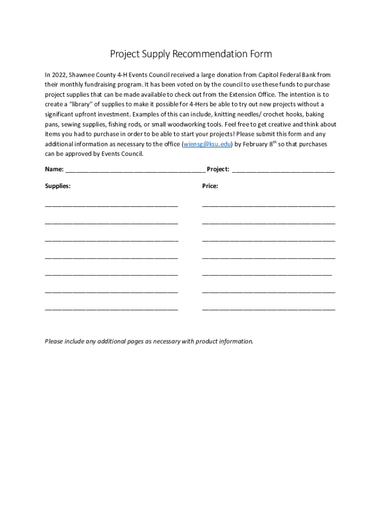 Project Supply Recommendation Form In 2022, Shawnee County 4H Events Council received a large donation from Capitol Federal Bank from their monthly fundraising program. It has been voted on by the