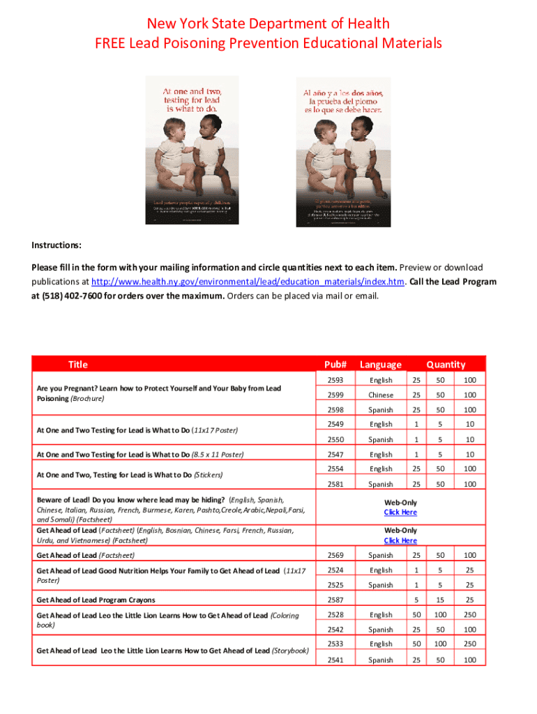 New York State Department of Health FREE Lead Poisoning Prevention Educational MaterialsInstructions: Please fill in the form with your mailing information and circle quantities next to each item.