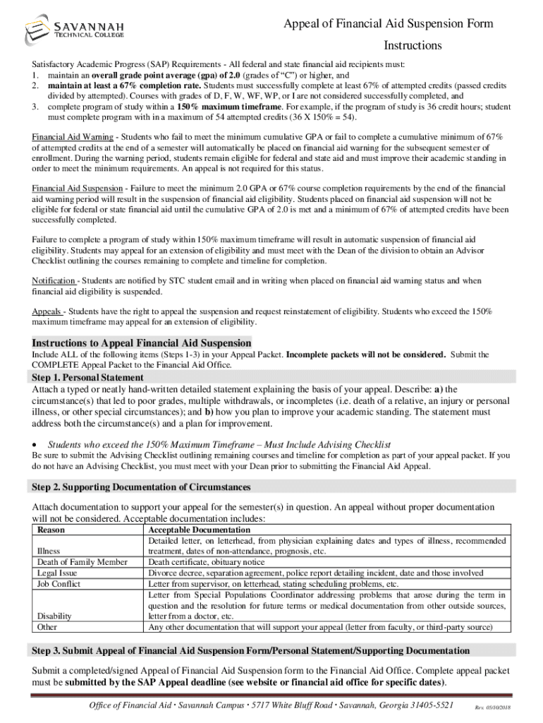 Appeal of Financial Aid Suspension Form Instructions Satisfactory Academic Progress (SAP) Requirements All federal and state financial aid recipients must: 1. Maintain an overall grade point average