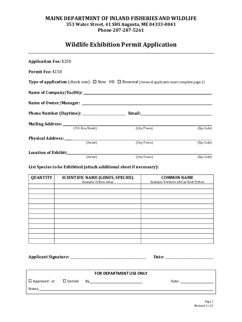 MAINE DEPARTMENT OF INLAND FISHERIES AND WILDLIFE 353 Water Street, 41 SHS Augusta, ME 043330041 Phone 2072875261Wildlife Exhibition Permit Application Fee: $250 Permit Fee: $150Type of application