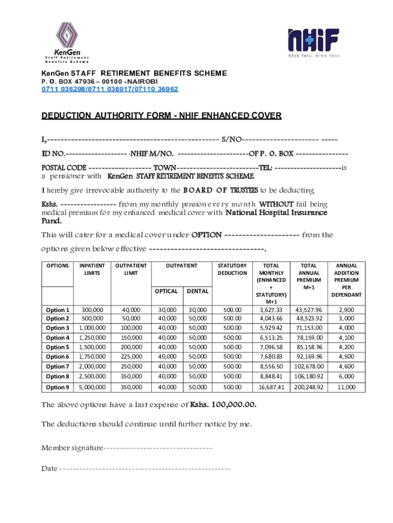 Ken Gen STAFF RETIREMENT BENEFITS SCHEME P. 0. BOX 47936 00100 NAIROBI 0711 036298/0711 036917/07110 36962DEDUCTION AUTHORITY FORM NAIF ENHANCED COVER. I, S/NO ID NO.NAIF M/NO. OF P. 0. BOX POSTAL