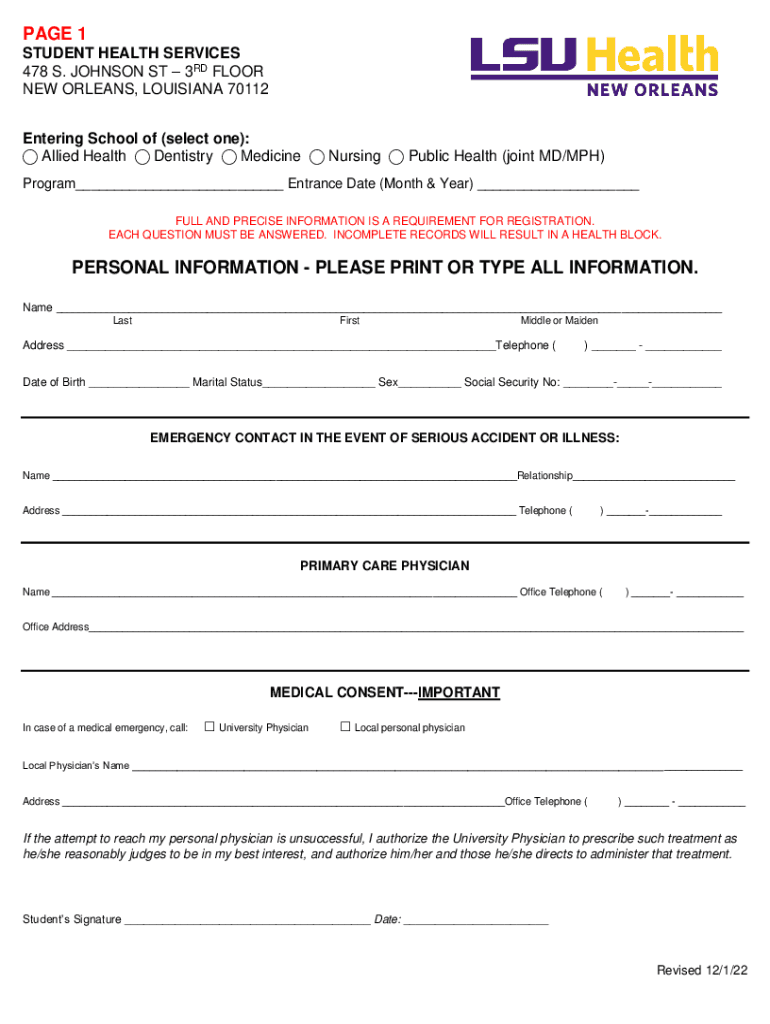 PAGE 1 STUDENT HEALTH SERVICES 478 S. JOHNSON ST 3RD FLOOR NEW ORLEANS, LOUISIANA 70112 Entering School of (select one): Allied Health Dentistry Medicine Nursing Public Health (joint MD/MPH) Program___