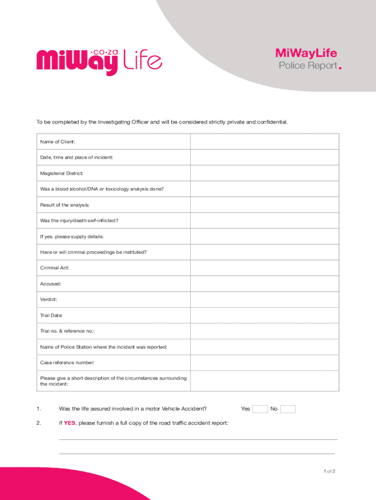 Midlife Police Report be completed by the Investigating Officer and will be considered strictly private and confidential. Name of Client: Date, time and place of incident: Magisterial District: Was