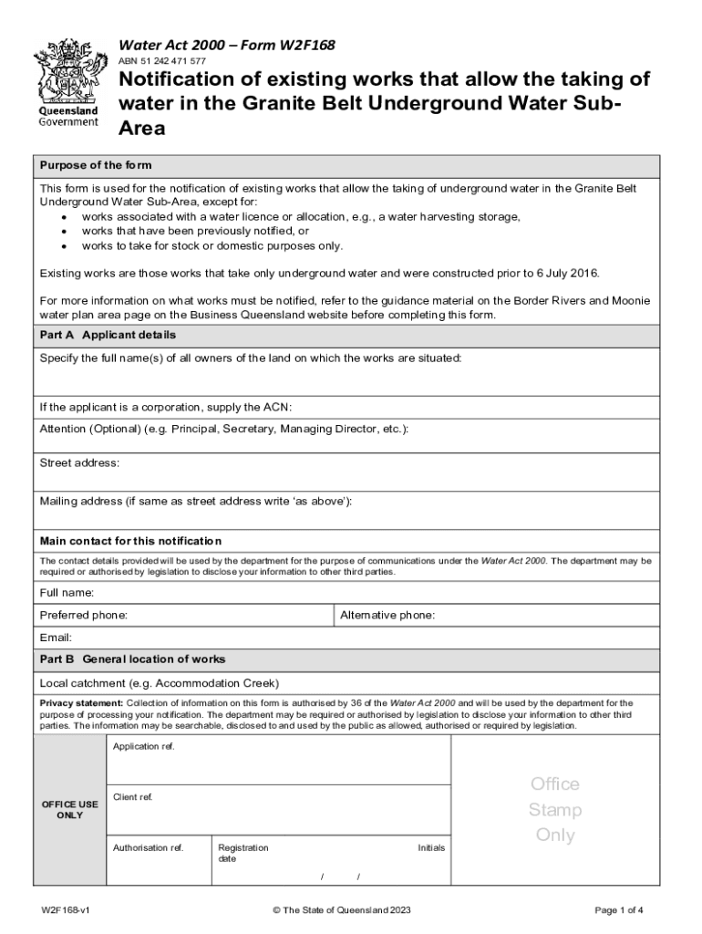 Water Act 2000 Form W2F168 ABN 51 242 471 577Notification of existing works that allow the taking of water in the Granite Belt Underground Water Subarea Purpose of the form This form is used for the