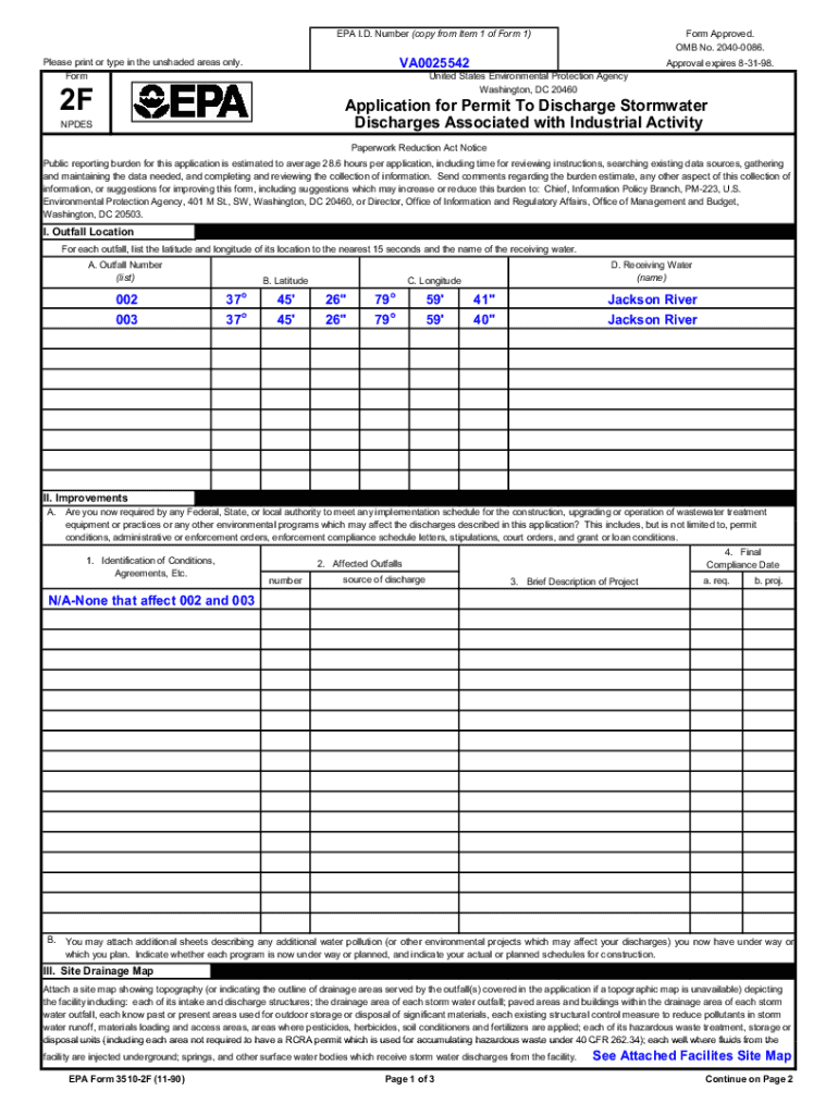 EPA I.D. Number (copy from Item 1 of Form 1)Form Approved. OMB No. 20400086.VA0025542Approval expires 83198. Please print or type in the unshaded areas only. Formulated States Environmental Protection