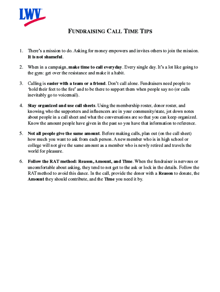 FUNDRAISING CALL TIME TIPS 1. There's a mission to do. Asking for money empowers and invites others to join the mission. It is not shameful.2. When in a campaign, make time to call every day. Every
