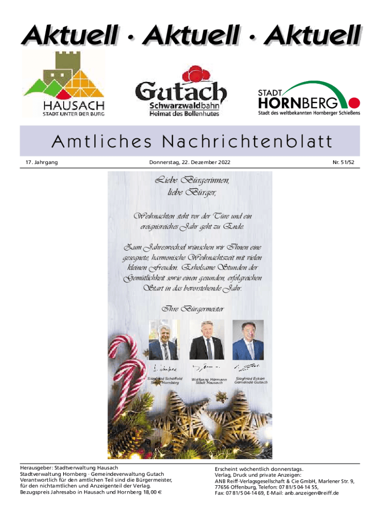 Actually AktuellAmtliches Nachrichtenblatt 17. JahrgangDonnerstag, 22. December 2022Nr. 51/52Liebe Brgerinnen, Liege Berger, Weihnachten stent VOR her TRE UND an ereignisreiches Jar get EU End. Sum