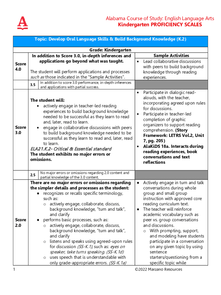 Alabama Course of Study: English Language Arts Kindergarten PROFICIENCY SCALES Topic: Develop Oral Language Skills & Build Background Knowledge (K.2)Score 4.0Grade: Kindergarten In addition to Score
