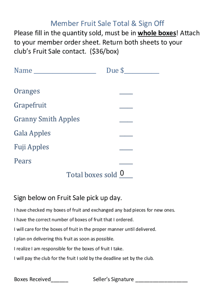 Member Fruit Sale Total & Sign Please fill in the quantity sold, must be in whole boxes! Attach to your member order sheet. Return both sheets to your clubs Fruit Sale contact. ($36/box) Name ___