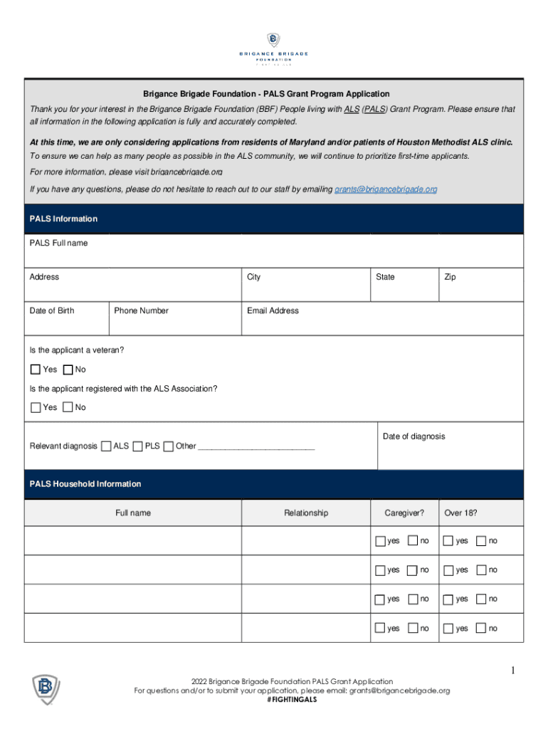 Brigade Foundation PALS Grant Program Application Thank you for your interest in the Brigade Foundation (BBF) People living with ALS (PALS) Grant Program. Please ensure that all information in the
