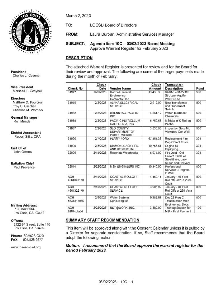 March 2, 2023, TO:LOC SD Board of DirectorsFROM:Laura Durban, Administrative Services ManagerSUBJECT:Agenda Item 10C 03/02/2023 Board Meeting Approve Warrant Register for February 2023DESCRIPTION