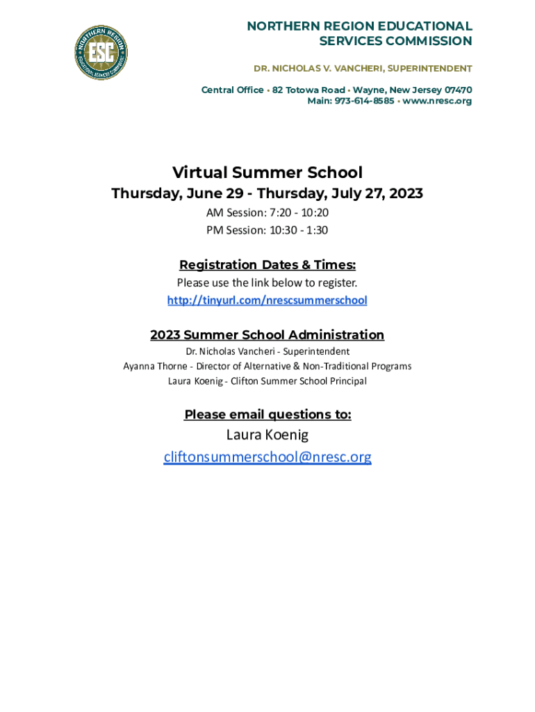NORTHERN REGION EDUCATIONAL SERVICES COMMISSION DR. NICHOLAS V. RANCHERS, SUPERINTENDENT Central Office 82 Toyota Road Wayne, New Jersey 07470 Main: 9736148585 www.nresc.orgVirtual Summer School Thursday,