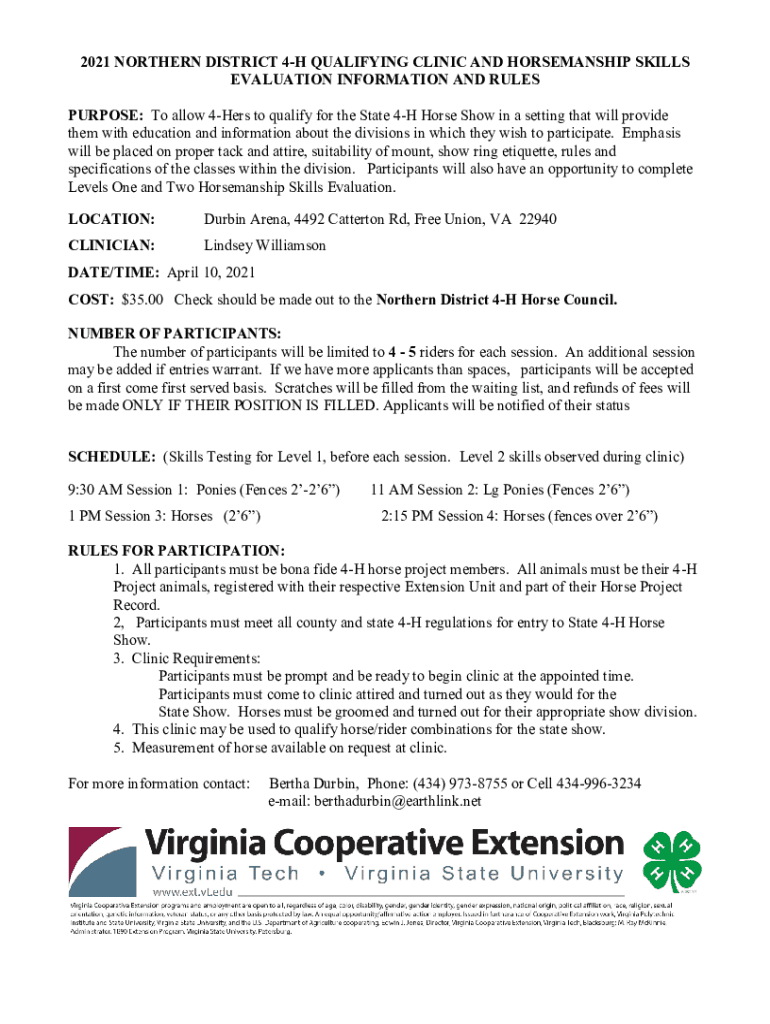 2021 NORTHERN DISTRICT 4H QUALIFYING CLINIC AND HORSEMANSHIP SKILLS EVALUATION INFORMATION AND RULES PURPOSE: To allow 4Hers to qualify for the State 4H Horse Show in a setting that will provide them