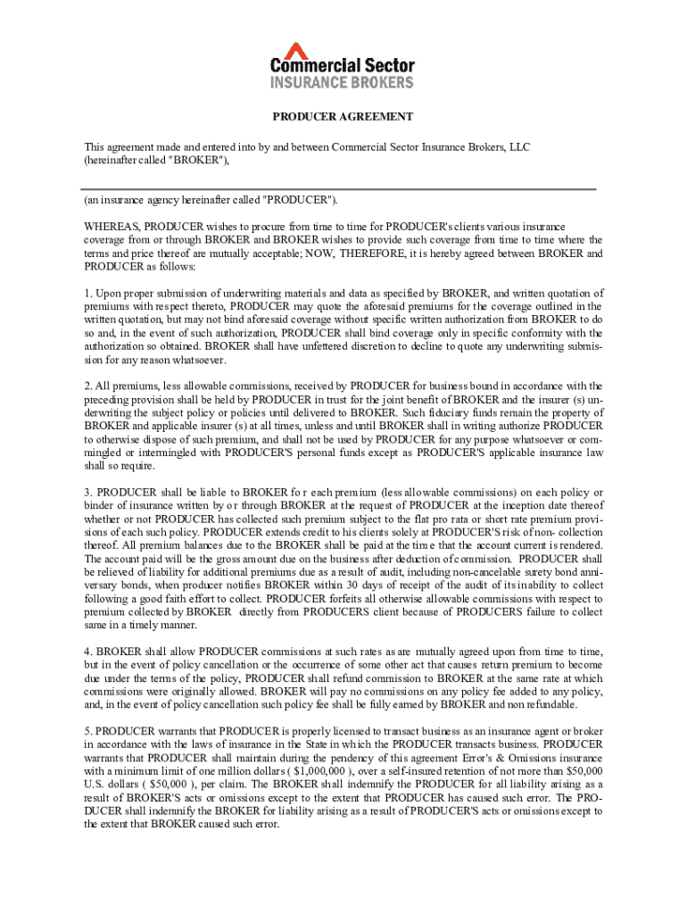 PRODUCER AGREEMENT This agreement made and entered into by and between Commercial Sector Insurance Brokers, LLC (hereinafter called \” BROKER\'\'), (an insurance agency hereinafter called \” PRODUCER\”).