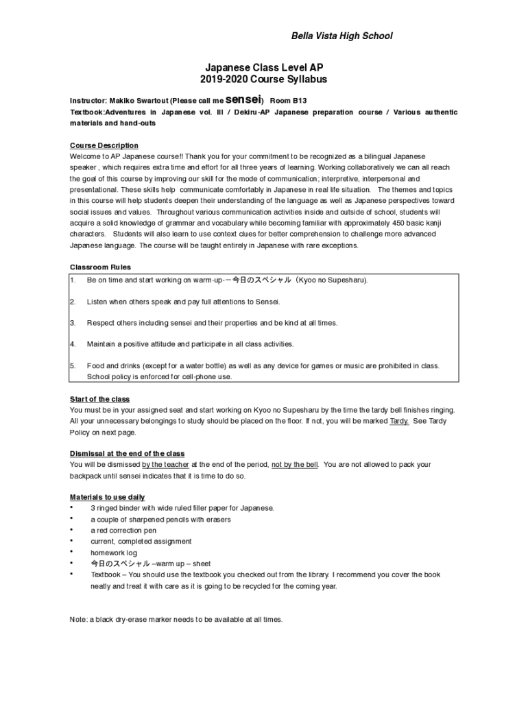 Bella Vista High School Japanese Class Level AP 20192020 Course Syllabus Instructor: Making Surtout (Please call me sensei) Room B13 Textbook:Adventures in Japanese vol. III / DekiruAP Japanese preparation